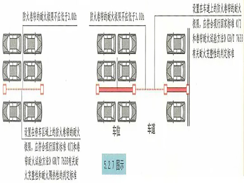 當(dāng)防火卷簾的耐火極限僅符合現(xiàn)行國(guó)家標(biāo)準(zhǔn)《門和卷簾的耐火試驗(yàn)方法》GB/T 7633有關(guān)耐火完整性的判定條件時(shí),應(yīng)設(shè)置自動(dòng)噴水滅火系統(tǒng)保護(hù)。自動(dòng)噴水滅火系統(tǒng)的設(shè)計(jì)應(yīng)符合現(xiàn)行國(guó)家標(biāo)準(zhǔn)《自動(dòng)噴水滅火系統(tǒng)設(shè)計(jì)規(guī)范》GB 50084的規(guī)定,但火災(zāi)延續(xù)時(shí)間不應(yīng)小于該防火卷簾的耐火極限。汽車庫(kù)、修車庫(kù)、停車場(chǎng)設(shè)計(jì)防火規(guī)范 GB50067-2014 5.2.7 設(shè)置在車道上的防火卷簾的耐火極限,應(yīng)符合現(xiàn)行國(guó)家標(biāo)準(zhǔn)《門和卷簾的耐火試驗(yàn)方法》GB/T 7633有關(guān)耐火完整性的判定標(biāo)準(zhǔn);設(shè)置在停車區(qū)域上的防火卷簾的耐火極限,應(yīng)符合現(xiàn)行國(guó)家標(biāo)準(zhǔn)《門和卷簾的耐火試驗(yàn)方法》GB/T 7633有關(guān)耐火完整性和耐火隔熱性的判定標(biāo)準(zhǔn)。