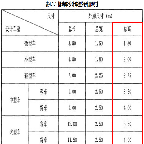 4.1.1 機動車庫應根據(jù)停放車輛的設計車型外廓尺寸進行設計。機動車設計車型的外廓尺寸可按表4.1.1取值。