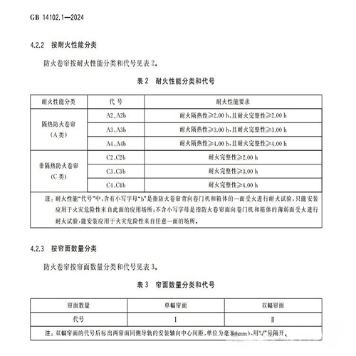 而今年4月29日發(fā)布的國(guó)家標(biāo)準(zhǔn)《防火卷簾 第1部分:通用技術(shù)條件》(GB14102.1-2024)則正式刪除了防火卷簾產(chǎn)品分類(lèi)中側(cè)向卷和水平卷類(lèi)別,這意味著防火卷簾的啟閉只有垂直卷這一個(gè)類(lèi)別;同時(shí),該標(biāo)準(zhǔn)還規(guī)定防火卷簾主要按照耐火性能和簾面數(shù)量進(jìn)行分類(lèi),耐火性能分類(lèi)由9類(lèi)簡(jiǎn)化為2類(lèi)6級(jí)(隔熱防火卷簾和非隔熱防火卷簾),簾面數(shù)量分為單幅簾面和雙幅簾面,具體如下: