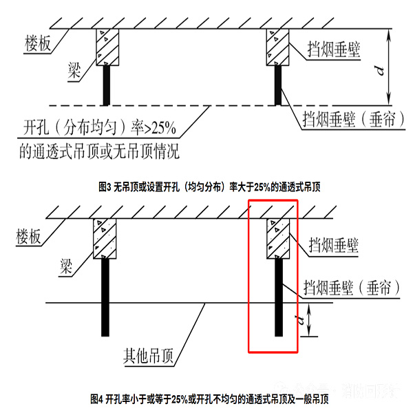 在圖4中,顯示吊頂開孔不均勻或開孔率小于或等于25%時(shí),吊頂內(nèi)還是應(yīng)設(shè)置擋煙垂壁的。
