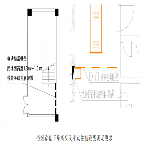 設(shè)計(jì)單位在設(shè)計(jì)圖紙上應(yīng)表達(dá)活動(dòng)擋煙垂壁手動(dòng)開啟裝置的具體安裝位置,施工單位按圖施工并應(yīng)聯(lián)動(dòng)調(diào)試實(shí)現(xiàn)功能,見下圖。